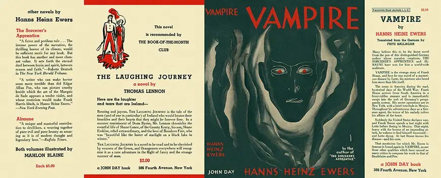 Vampire, the third and final novel in author Hanns Heinz Ewers’s Frank Braun trilogy, addresses this era of global vampirism. Set during the war but far from the battlefield, Vampire follows the Nietzschean hyper-individualist Braun as he becomes an effective propagandist for the German Empire while living and working as a lecturer in the United States. The ever-cynical Braun is good at giving speeches, and, during a long stayover in revolutionary Mexico, he proves his worth as a military advisor. However, despite all his success, Braun suffers tremendously throughout the novel: he experiences bouts of delirium punctuated by violent, vivid dreams, and a deep listlessness depresses his spirits whenever he is alone in his apartment. The cause of Braun’s affliction is unknown, but there seems to be a connection to Lotte van Ness, Braun’s old flame from Berlin, who has developed a keen interest in occultism since moving to America.